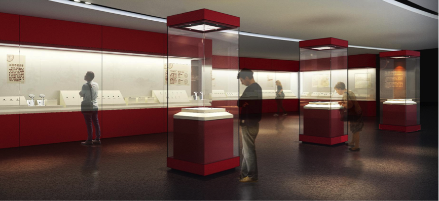 在錢幣裝置對(duì)面,設(shè)計(jì)通體櫥窗,串聯(lián)先秦至魏晉南北朝時(shí)期錢幣發(fā)展史,素雅連綿的山水畫卷與對(duì)側(cè)臨窗山脈相呼,借助通柜結(jié)合精品展柜的形式,展品結(jié)合圖文的手段,營(yíng)造現(xiàn)代中式的空間格調(diào)。
