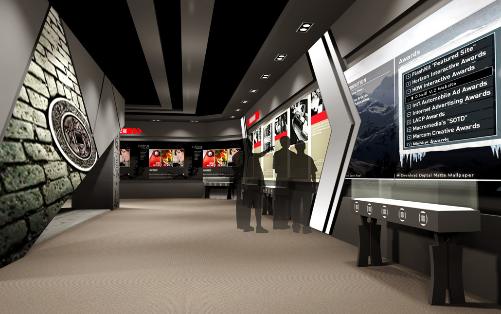 不同的位置上出現的直線呈現出不同的視覺效果,由于受到現代派功能主義建筑的影響,展覽空間中出現頻率高的是水平直線和垂直直線,傾斜線則根據空間中具體的設計需要來決定。在有限的展覽空間內能夠起到快速吸引觀眾視線的作用;垂直線比較穩定,在展覽空間中主要起到分割空間、限定各個子空間的作用;傾斜直線具有較強的運動感,能夠在展覽空間中營造出動態的視覺效果。